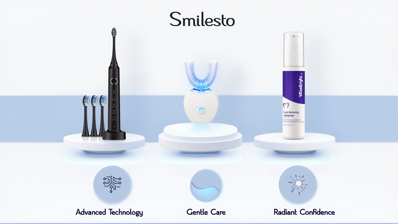 Smilesto offers a full range of premium oral care products β from ultrasonic toothbrushes to V-shaped brushes, water flossers, whitening gels, powders, and strips.